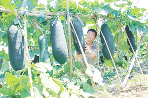 扶沟县吕潭乡农民种植的吊蔓露地黑冬瓜,生长期病害少,单棵结果率高,亩产达1万公斤,效益达8000元左右,深受种植户的喜爱。图为种植户在观察黑冬瓜的成熟度,预测上市时间。谷志方摄