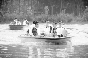 近日,扶沟县在北关大闸上游举行2016年防汛抢险演习。防汛抢险演习由该县人武部、水利局和消防大队联合举行,演习现场,民兵队员分别进行了堤防查险、城镇内涝、坍塌抢险和水上救援等演练。图为水上应急救援演习。纪俊辉 摄