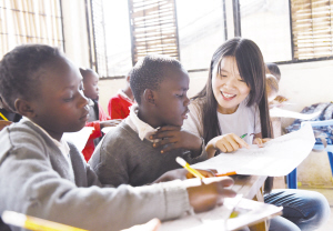 为肯尼亚贫民窟儿童“造梦” 8月2日,在肯尼亚首都内罗毕第二大贫民窟马萨雷的长青造梦小学,“造梦”公益组织的志愿者陈舒捷(右一)在给学生们上课。“造梦”公益组织分别于2014年7月和2015年7月在肯尼亚首都内罗毕的马萨雷贫民窟建立长荣希望小学和长青造梦小学,每年招募15到25名大学生志愿者前往肯尼亚支教,开展贫民窟援助项目。新华社发
