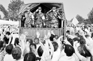 惜别抗洪子弟兵 8月4日,启程返回驻地的武警部队官兵向前来送别的群众敬礼。当日,随着抗洪抢险救援作业主体完工,驰援河北省邢台市洪涝灾区的武警水电部队官兵启程返回驻地。当地干部群众夹道送别抗洪子弟兵。新华社发