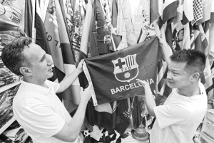 浙江义乌:奥运带动体育产品销售 8月3日,马其顿球迷阿夫尼(左)在浙江义乌国际商贸城体育用品市场采购巴塞罗那足球队挂旗。随着里约奥运临近,浙江省义乌市迎来体育用品销售旺季,许多海内外客商纷纷前往采购和订货。据义乌海关统计,2016年上半年,义乌市体育用品出口额约15亿元。 新华社发