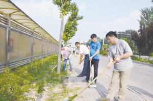 分包路段责任单位职工冒炎热义务劳动。记者 张猛 摄