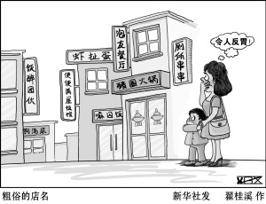 粗俗的店名 “泡友餐厅”“猪圈火锅”“厕所串串”“嘛囚饭”“狗浇尿”……近年来,各种令人匪夷所思的餐馆名在全国各地层出不穷。不少学者和顾客质疑,这样的确可以吸引消费者,但餐馆名粗俗化的倾向也令不少食者反感,对中国的饮食文化也是一种损害,应适可而止。 新华社发 翟桂溪 作