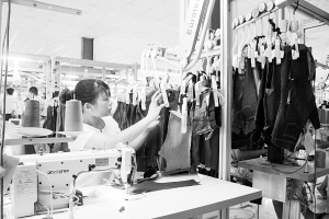 项城市产业集聚区庄吉服装是全国休闲服装第一品牌,总投资5亿元,目前已全部投产,年可加工1000万件休闲装、西装,企业总部正在筹备迁来项城,可吸纳近3000人就业,该市的农民不出家门就能实现就业,极大地缓解了留守妇女、留守儿童的问题。图为生产车间女工正在赶制订单服装。