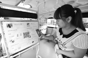 8月8日,一位乘客在扫描公交七夕交友微信群二维码。河南郑州公交二公司62路公交车车长云悉自己动手,将从社会征集到的单身乘客微信号、通过公交结缘夫妇的婚纱照和爱情主题漫画制成车贴,贴在车厢空白处,把公交车厢打造成一个移动的“相亲平台”,迎接七夕节的到来。