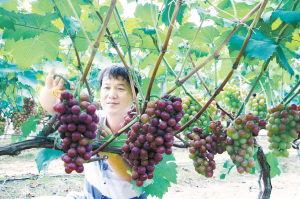 连日来,扶沟一农业生态园的300亩无公害葡萄相继成熟,吸引了大量附近群众来这里采摘或认领优良葡萄品种。图为管理人员正在采摘葡萄。谷志方 摄
