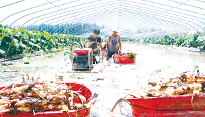 昨日,扶沟县旺达莲藕现代农业发展有限公司的员工正在采挖莲藕。该公司采用大棚种植莲藕,收获的鲜藕洁白如玉,脆甜爽口,提前上市两个月,比秋冬季节上市的莲藕每亩增加收入2500元。(谷志方 摄)