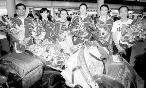 奥运会部分中国选手回京 8月14日,中国击剑队选手在北京首都国际机场合影。当日, 部分里约奥运会完赛中国运动员抵达北京首都国际机场。新华社发