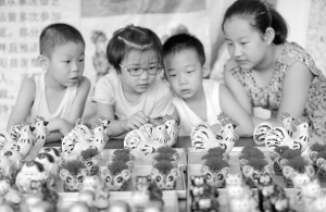 8月14日,孩子们在河北省饶阳县文化馆观赏泥塑作品。暑假期间,饶阳县文化馆开办“学传统民俗 度文化暑假”系列公益活动,孩子们在老艺人的指导下学习泥塑、陶艺、手绘等传统技艺,感受民俗文化艺术魅力。