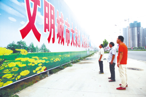 8月18日,项城市民在迎宾大道观看路两侧围挡上的内容。这些围挡“穿上新衣”后,既营造了文明城市创建的氛围,又保护了施工区域的环境卫生。