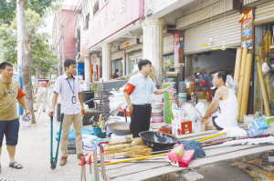 8月18日,三店镇机关干部职工20多人冒着酷暑走上街头,对镇区内主要路段两侧占道经营以及边道内垃圾、杂草、小广告等开展整治清除活动。树保 光辉 洁石 摄