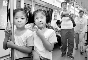 郑州地铁2号线一期工程开通试运营 8月19日,一对双胞胎小朋友乘坐地铁2号线。当日,郑州地铁2号线一期工程正式开通试运营,此线路的开通将大大改善郑州市区交通拥堵情况。郑州地铁2号线一期工程北起刘庄站,南至南四环站,均为地下线,设站16座。新华社记者 李安 摄