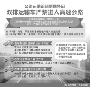 新华社北京8月18日电(记者 赵文君)根据交通运输部等部门的新规定,自9月21日起,严禁双排车辆运输车进入高速公路;2018年7月1日起,全面禁止不合规车辆运输车通行,普及标准货运车型。
