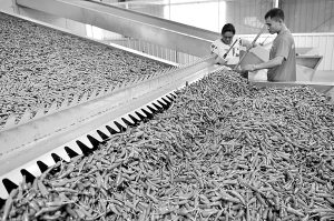 湖北宣恩辣椒丰收加工忙 8月19日,在湖北省宣恩县一生态农业公司的车间里,工人将辣椒送入烘烤生产线。时值初秋,湖北省宣恩县农民种植的5万亩辣椒进入收获期。当地企业及时组织工人加工客户需要的干辣椒,确保椒农获得好收成。新华社发