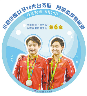 跳水“梦之队”继续成为中国队稳定的夺金点,初次参加奥运会的“00后”小将任茜和队友司雅杰在女子10米台决赛中交替领先,最终任茜夺得金牌,司雅杰摘银,这是中国跳水队在里约收获的第六金。