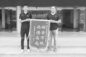 本报讯 8月16日,太康县第三高级中学学生张富行在家人的陪同下,将一面写有“拾金不昧品德高尚”的锦旗送到太康县供电公司,感谢该公司员工胡前进拾金不昧的高尚品德。