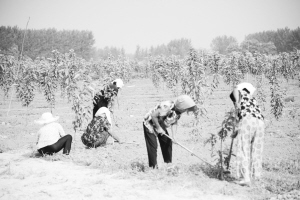 郸城县万丰源种植合作社一期流转土地500亩,通过与中国农科院技术合作,引进种植高新果树——美国车厘子。新品种引进后,亩均收入有望达到5万元左右,将有效带动周边群众致富。图为田间管理果树的农民。 记者 沈湛 摄