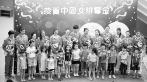 国家女排与香港市民互动 8月28日,国家女排主教练郎平(后排左一)和球员与小朋友合影。当日,里约奥运会内地奥运精英代表团中的国家女排成员在香港奥海城商场与香港市民互动。新华社发