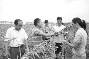 项城芝麻常年种植面积稳定在30万亩以上,白芝麻获得了国家优质白芝麻原产地认证标记,与省、市农科院开展了科研项目协作,建立了芝麻加工企业20多家,提高了芝麻附加值,为增加农民收入、发展项城经济拓展了新的空间。图为省农科院有关专家在项城市永丰镇大黄村进行测产验收。 张永久 摄