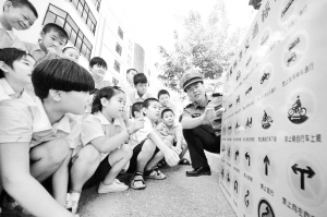 ④ 9月1日,河北省武邑县武罗学校,民警向学生介绍道路安全标识。(本栏图片均为新华社发)