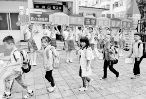 ① 9月1日,全国各地迎来秋季开学季。当日,河北省秦皇岛市先盛里小学,学生在文明用语“文明小火车”的迎接下走进校园。