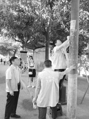 日前,川汇区住建局按照市、区两级的决策和部署,狠抓整改落实,务求工作实效,积极做好省级文明城市创建工作。图为9月1日上午,该局志愿者在中州大道责任路段清理违规小广告。