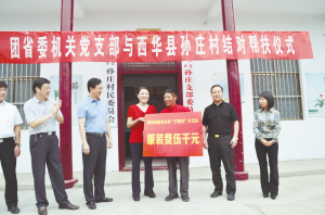 本报讯(记者 张猛)8月30日,共青团河南省委机关党支部与西华县迟营乡孙庄村结对帮扶仪式举行。团省委副书记李若鹏、李健涛,西华县委书记林鸿嘉,团省委青年志愿工作部部长韩冰,省团校党委书记曾勇,共青团周口市委书记王春华,西华县委常委、组织部长胡军华等出席仪式。