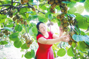 昨日,扶沟县白潭镇王庄村村民王迎春在为猕猴桃疏叶透光。今年,王迎春采用猕猴桃下散养土鸡的立体种养模式种植了10亩猕猴桃,亩效益在1万元左右。