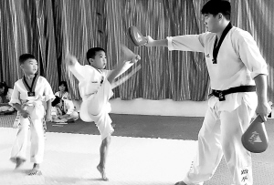 昨日,几名跆拳道爱好者在教练的辅导下练习。据了解,跆拳道作为一种健身运动不仅能提高孩子的体质,而且对孩子的品质培养也有很大的帮助,得到了越来越多的家长的支持。 记者 沈湛 摄