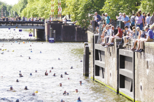 当日,2500多名游泳爱好者在荷兰阿姆斯特丹运河畅游2000多米,为“渐冻症”患者筹款。这一活动始于2012年,每年举办一次。
