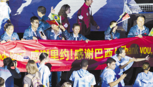 在里约,中国残奥代表团再次站在了世界之巅。中国残奥军团共斩获107金81银51铜共239枚奖牌,高居金牌榜、奖牌榜第一位,自2004雅典残奥会以来连续4届稳居残奥会金牌榜首位。金牌榜上,英国以64金列第二,乌克兰以41金排第三。另外,有63个代表团获得了金牌,83个代表团登上了领奖台。图为中国代表团手持“感谢里约!感谢巴西!”的横幅入场。