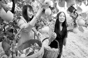 北京乡村秋色美 游客在北京密云区不老屯镇的果园内采摘(9月17日摄)。 近日,北京周边乡村逐渐进入金秋旅游旺季,吸引了大批游客和市民前往休闲旅游。新华社发