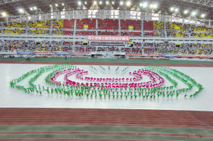 16时54分,运动员、裁判员入场完毕,全场起立,在庄严的国歌声中,鲜艳的五星红旗冉冉升起,高高飘扬在运动场上空。