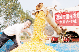 昨日,项城市秣陵镇后年湾村种粮大户年国福看着收获的玉米,笑意写在脸上。年国福成立了专业合作社,按照合作社+农户的模式,带领农民种植玉米700多亩,由于玉米品种优良、合理密植,在减产之年平均亩产仍在1000斤以上。王洁石 摄