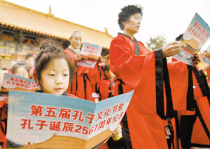 9月28日,参加济南府学文庙祭孔活动的市民在诵读祭文。当日,各地纷纷举办祭孔活动,纪念先贤孔子诞辰2567年。新华社发