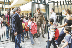 10月10日,在希腊首都雅典,教师和希腊学生家长在一所公立学校欢迎难民儿童入学。当天,首批1500名滞留在希腊的难民儿童开始在6座难民营和全国各地的20所公立学校上课。新华社发
