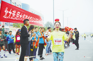 10月6日,由项城市委宣传部、市文明办、市教育体育局联合主办的首届马拉松比赛在城南新区举行,2000人参加了比赛。图为选手在终点进行冲刺。张永久 摄