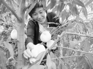 上图:日前,扶沟县和顺农牧合作社管理人员在查看雪桃的生长情况。该合作社引进的50亩雪桃,通过科学管理,今年开始挂果,预计10月中下旬收摘。谷志方 摄