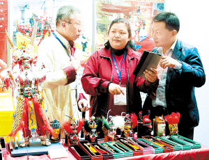 在刚刚结束的第三届中原(鹤壁)文化产业博览交易会上,鹿邑县文博会展区设计别致、制作精美,展示了民俗文化产品、工艺美术品、非物质文化遗产产品、文化创意、摄影等10余类自主知识产权和具有地方文化特色的文化精品。图为鹿邑县工作人员与台湾艺术家交流。