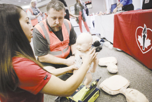 防患于未然 10月20日,在加拿大温哥华举行的地震演习中,市民学习使用体外除颤器。当日,温哥华所在的不列颠哥伦比亚省举行地震演习,以提高人们的防灾意识,和灾害来临时自救及救人的能力。新华社发