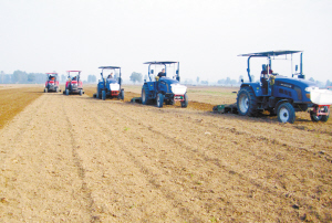 国家级示范性合作社——扶沟县交拓瓜菜专业合作社,拓宽服务范围,增加服务项目,于今年麦播期间,每天出动5部大型深翻拖拉机为社员服务,免费为江村镇李田村的2900多亩地深翻旋松,受到了当地群众的一致好评。图为大型深翻拖拉机正在田间作业。