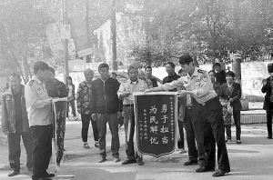 近日,太康县公安局转楼派出所干警通过连续三天三夜的追踪,成功破获了一起借向群众推销太阳能之机骗取群众钱财的诈骗案,为群众挽回经济损失数万元。图为前楼村和谢庄村群众代表向派出所赠送锦旗表示谢意。徐伟 摄