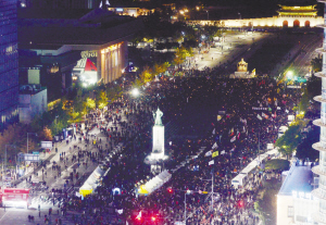 10月29日,韩国民众在首尔市中心举行集会。随着韩国总统朴槿惠“亲信干政”事件持续发酵,韩国民众29日在首尔市中心举行近万人规模集会,要求朴槿惠下台并查明事件的真相。 新华社发