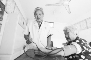 商水县练集镇梁楼村村民苑乃合坚持上门行医50年,从不收取病人的挂号费、诊疗费、出诊费,因为看病便宜,医术又好,老苑在十里八村名气很大,乡亲们都称呼他为“健康卫士”。图为苑乃合在为病人免费量血压。 刘飞 闫志凯 摄