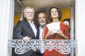 《温柔之歌》获法国龚古尔文学奖 这是11月3日在法国巴黎德鲁昂饭店拍摄的获奖后的莱拉·斯利马尼(右)。2016年度法国龚古尔文学奖当日在巴黎德鲁昂饭店揭晓,35岁的女作家莱拉·斯利马尼以小说《温柔之歌》获奖。获奖者的奖金只有10欧元,但通常获奖作品的销量可至少达到40万册。新华社发