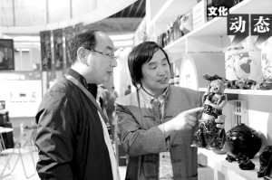 近日,第三届中原文化产业博览交易会在鹤壁开幕,张振福泥塑作品应邀参展。图为张振福正在向嘉宾介绍钧瓷泥塑作品——《听雨》。
