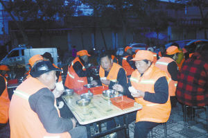 11月15日早6点,天刚蒙蒙亮,沈丘县长安西路的爱心粥屋前,已经坐满了正在吃早餐的环卫工人。据粥屋负责人王胜利介绍,粥屋从今年3月份开始运营,至今已经为广大环卫工人提供了1.7万多份爱心早餐。一碗粥,一个馒头,一盘热菜,不仅温暖了环卫工人的心窝,也温暖了整座小城,传播了一份正能量。 (王祥宇 摄)