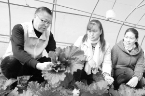 近段时间气温下降、阴雨侵袭。扶沟县党员志愿者服务队深入农户大棚,传授蔬菜防寒和病虫害防控技术。图为该县蔬菜局高级农艺师在为菜农指导大棚越冬菜管理技术。