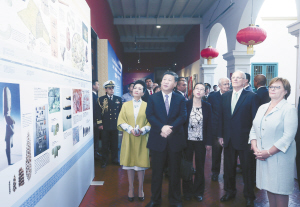 11月21日,国家主席习近平和夫人彭丽媛在利马同秘鲁总统库琴斯基和夫人兰格共同出席中拉文化交流年闭幕式并参观“天涯若比邻-华夏瑰宝展”。