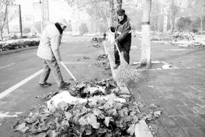 昨日,天气转晴,几名环卫工人正在清扫道路上的残雪和落叶。降雪过后,天气转晴,市环卫部门抓住有利时机,组织人员对中心城区卫生进行清理,以便于市民出行。记者 沈湛 摄